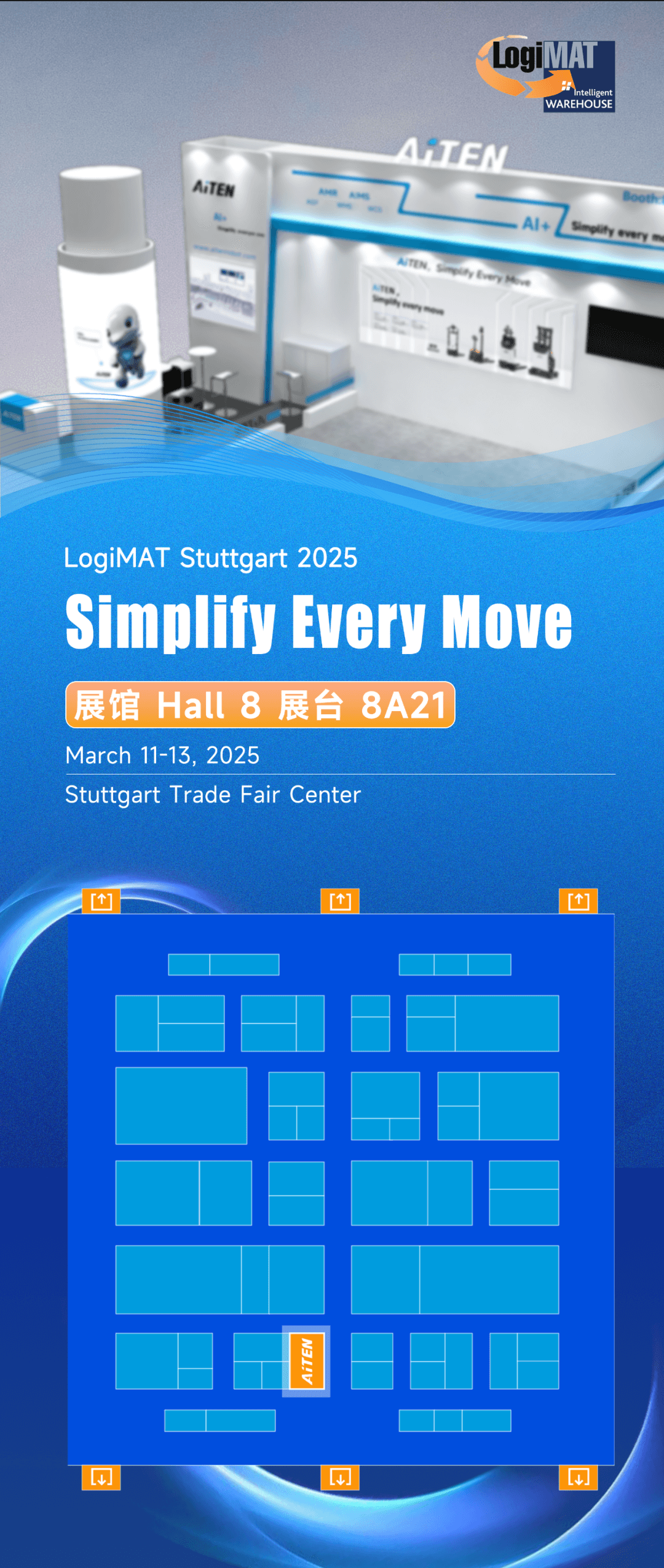 2025 年 3 月,全球物流行业的目光将聚焦于两大顶级盛会——德国 LogiMAT 物流展与美国 ProMAT 物流展作为物流智能化领域的先锋,huatihui AiTEN将携前沿技术与解决方案重磅登场,向世界展示智能物流的未来图景。